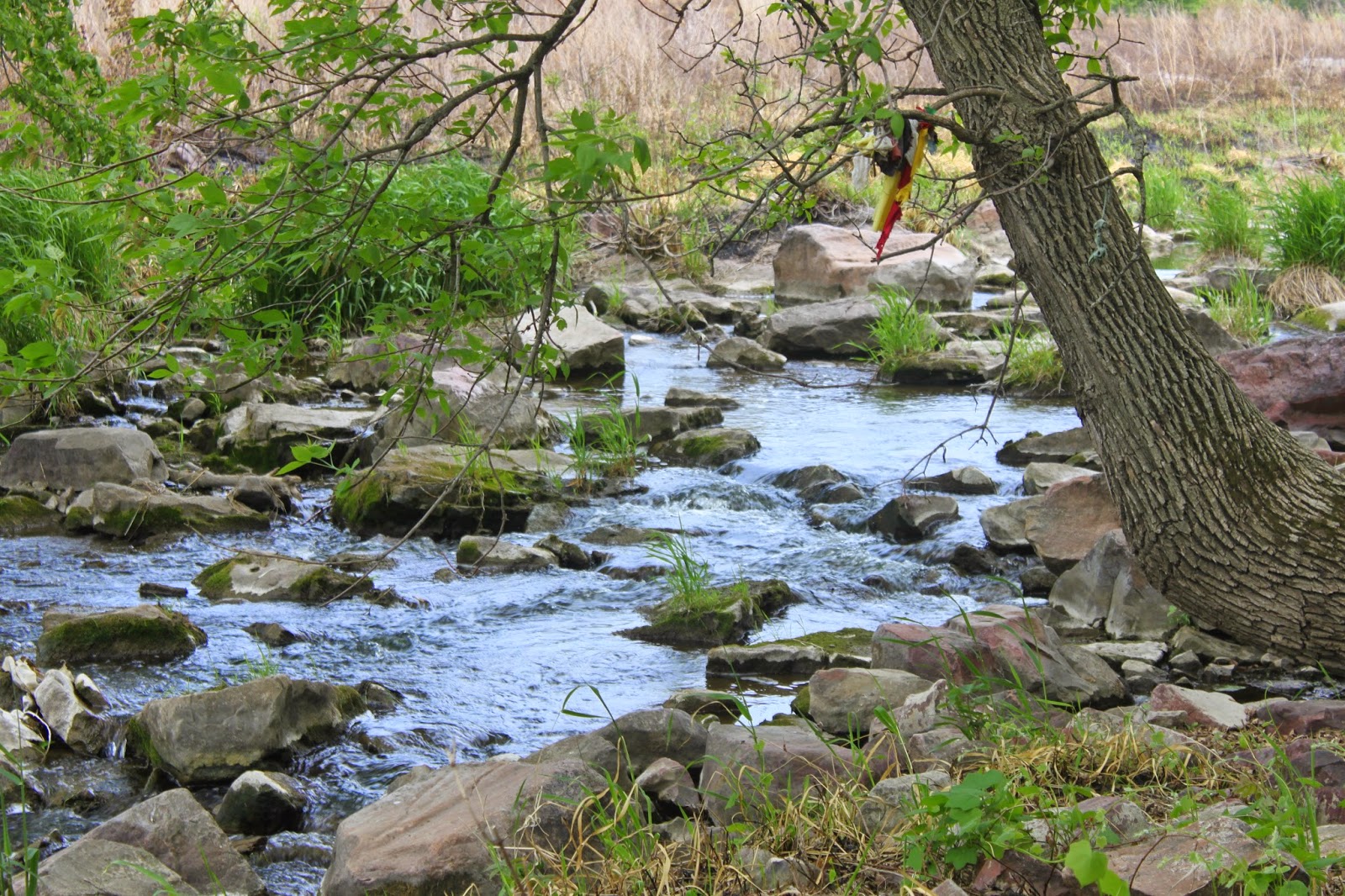 The trail starts out in prairie grass and quickly dips down to follow the creek...